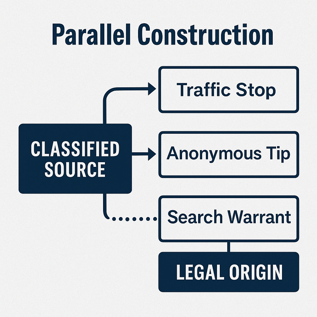 At its core, parallel construction is the process of building a second, apparent legal path for evidence to obscure its sensitive or unlawful source. For example, a secret intelligence tip may prompt agents to monitor a vehicle until a traffic violation occurs, providing a plausible—but misleading—justification for a search Wikipedia, BJCL.