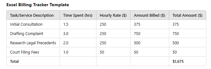 Billing Tracker: Include columns for time entries, task descriptions, hours billed, rate, and total cost. This would help ensure accurate billing and make it easier to prepare invoices.